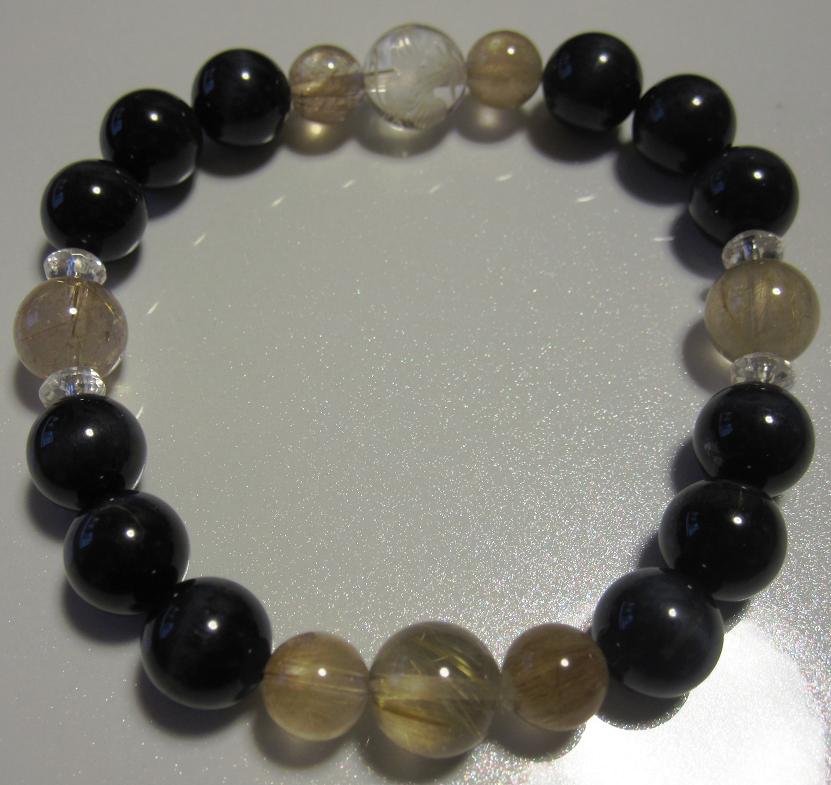もともと姪がお店で買ったものですが、虎目石のみで作ってあったもので、私が感じたのは、若い女の子には強すぎるということでした。それで、魔よけになるものでも針水晶の6mmと水晶10mmを使って作り直しをしました。ほどよく運をくれそうなパワーブレスが出来上がって